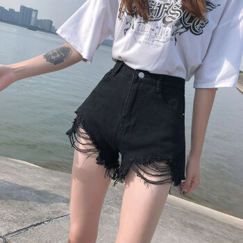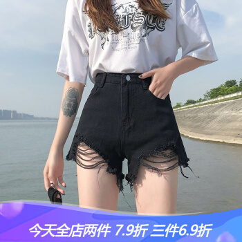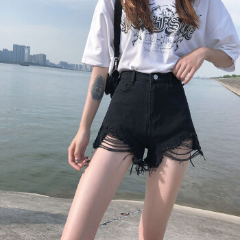 沫澜仟衣黑色破洞牛仔短裤女阔腿宽松高腰显瘦2020夏季薄款潮流时尚加大码胖mma字热裤 黑色 26码
