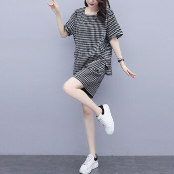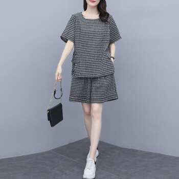 伊轩坊短裤女夏2020新款大码女装韩版宽松显瘦洋气减龄格子休闲时尚套装女两件套 格子套装 L