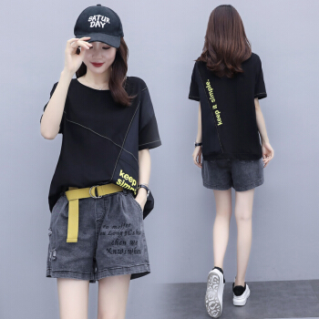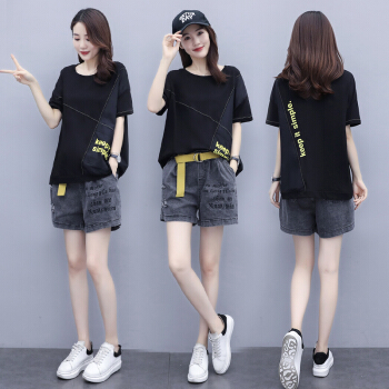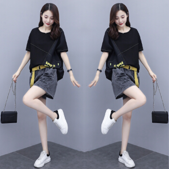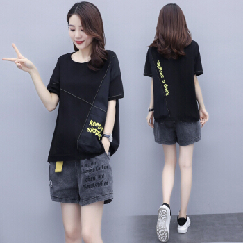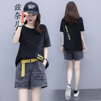 兹奈儿2020年夏季新款时尚印花百搭潮流半袖短袖T恤+刺绣宽松松紧牛仔短裤女宽松新品套装两件套 黑色 M
