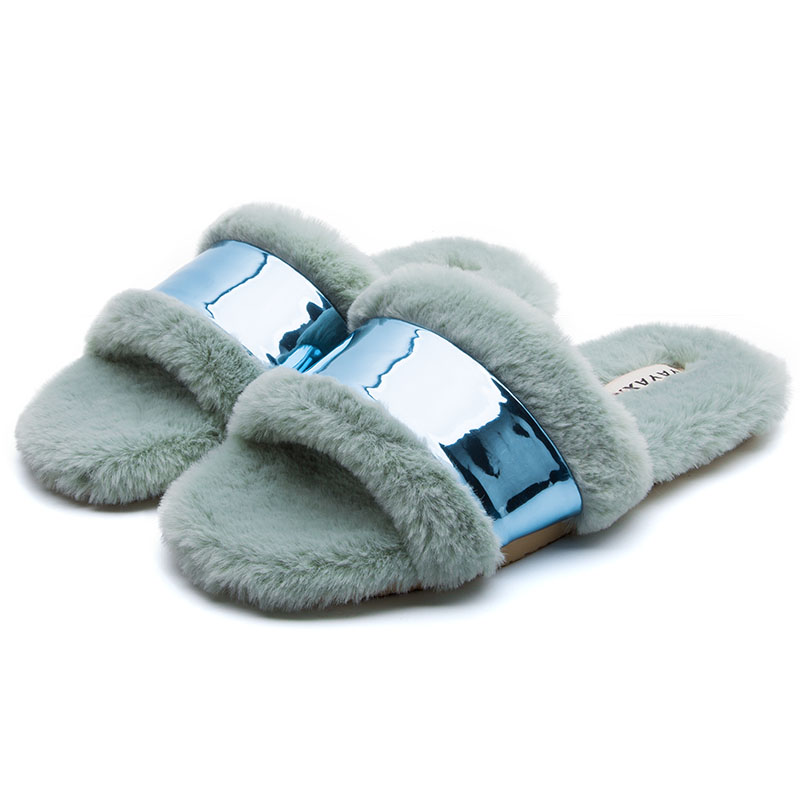 时尚亮片毛绒开口外穿毛拖鞋【短毛绒/浅绿】