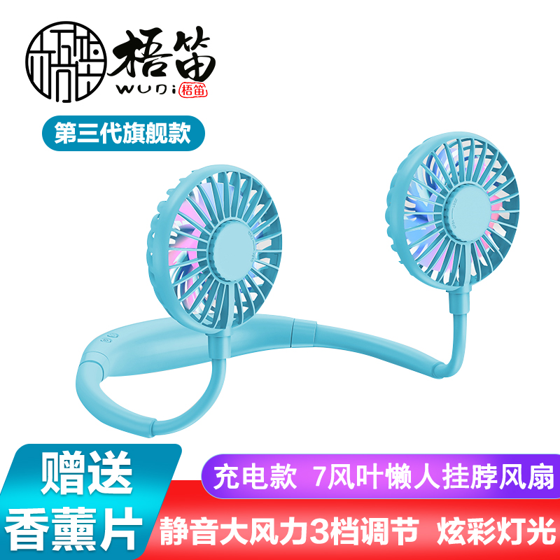 【超值单品】【带彩灯+香薰】第三代旗舰款7叶片挂脖风扇USB充电型【塑料+硅胶/蓝色】