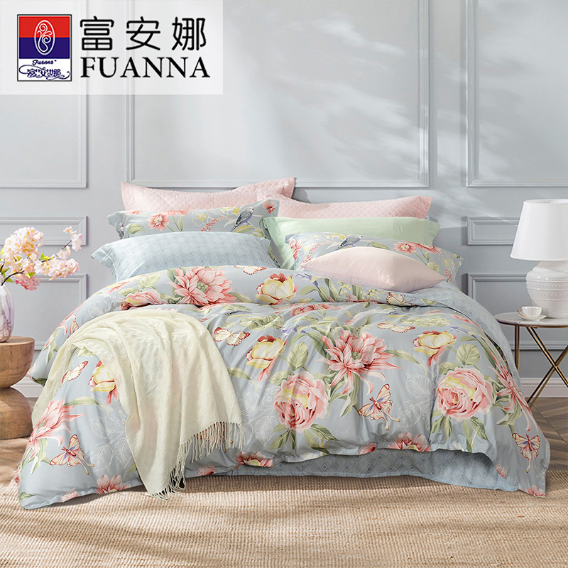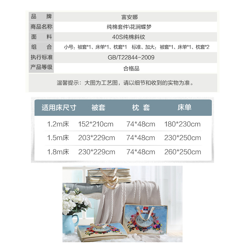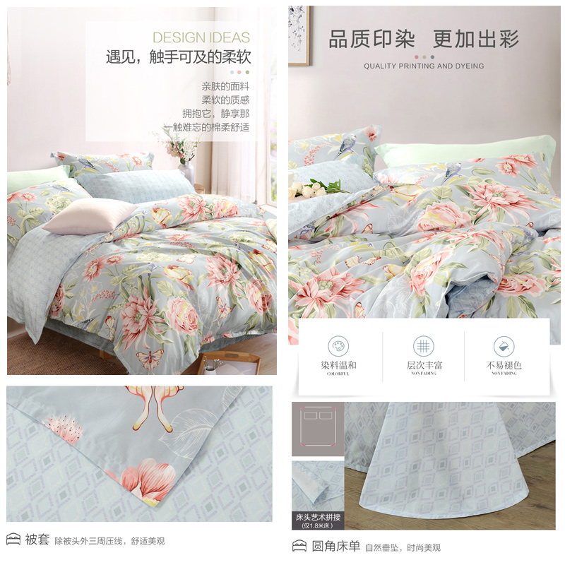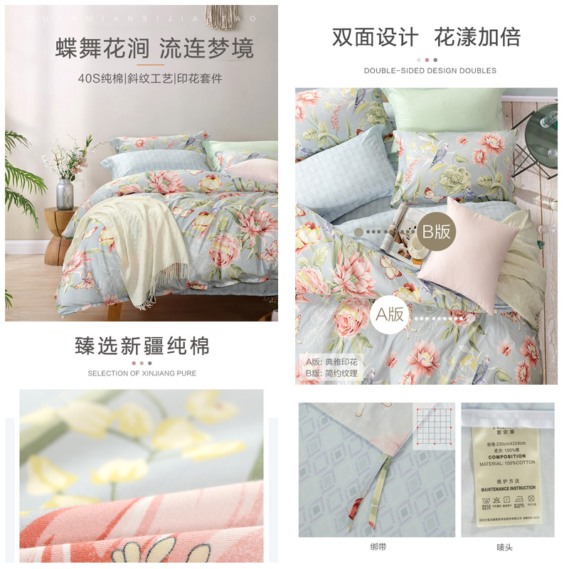 花涧蝶梦 床单三件套(被套1件床单1件枕套1件)(适合1.2米床)【纯棉/蓝】