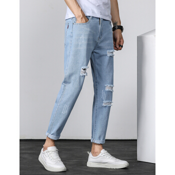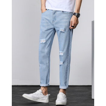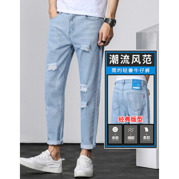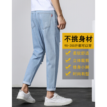 等歌 牛仔裤男士休闲裤男裤潮牌裤子男新款夏季韩版修身直筒束脚中高腰弹力复古磨透气小脚九分长裤子男 803蓝色 XL