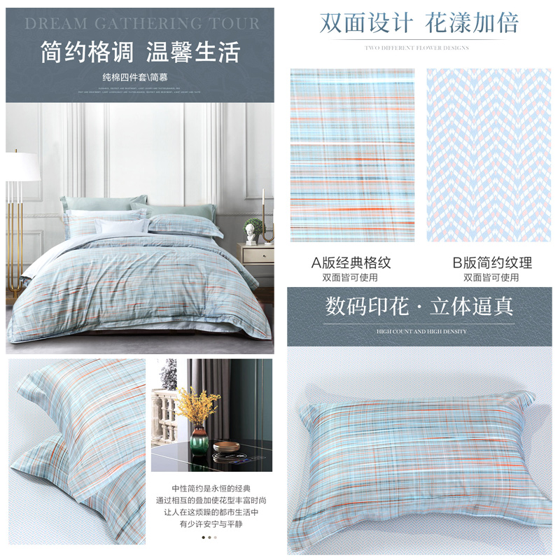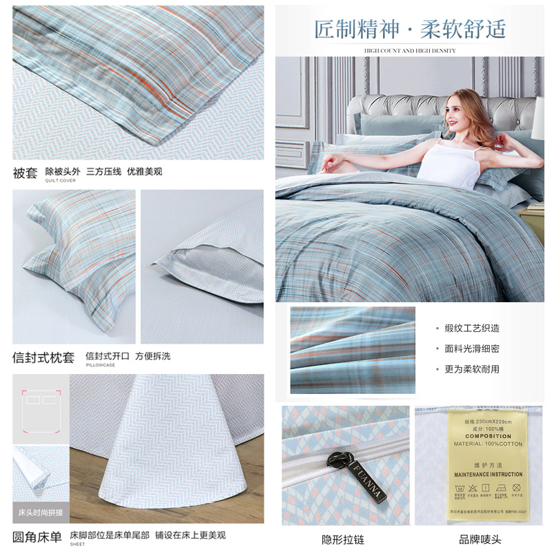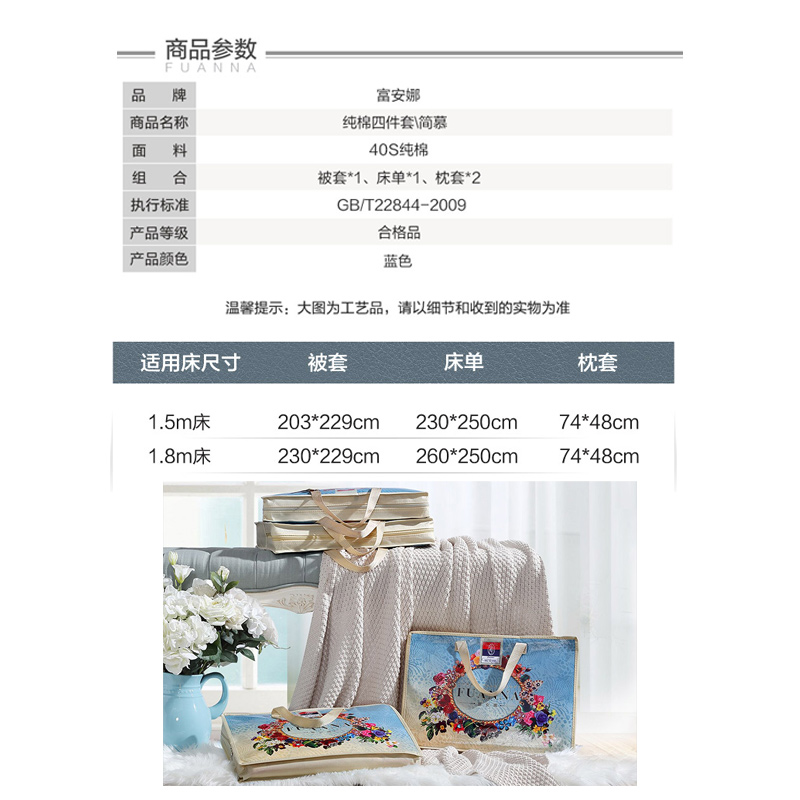 简慕 床单四件套(被套1件床单1件枕套2件)(适合1.5米床)【纯棉缎纹/蓝】