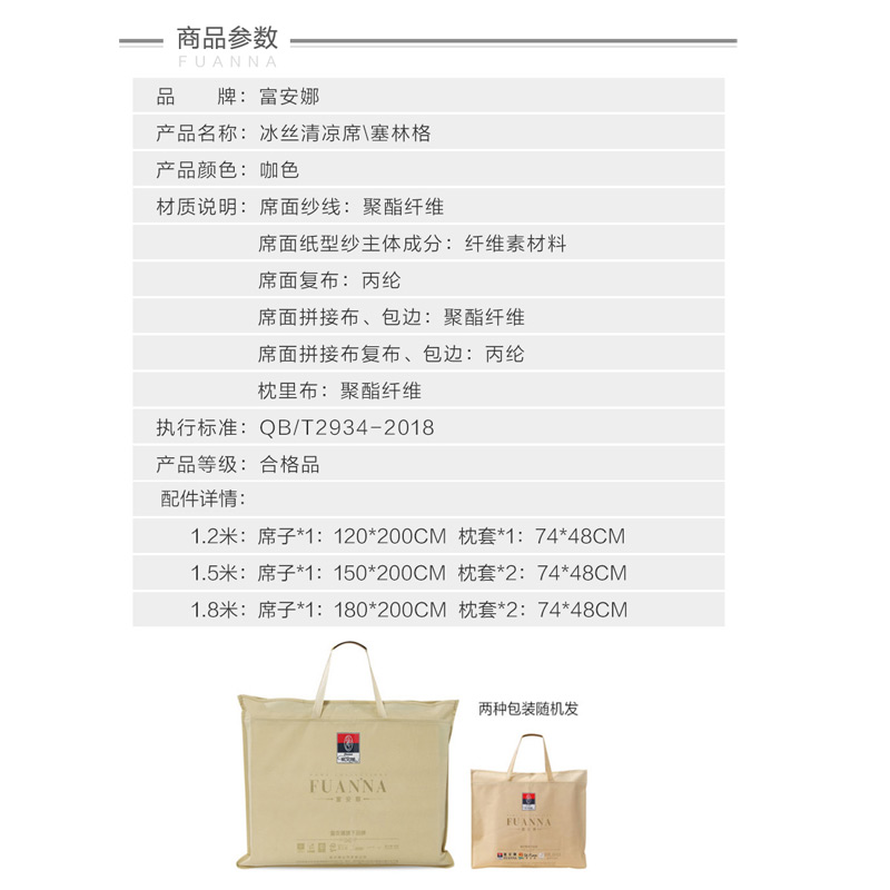 塞林格 冰丝清凉席三件套(凉席1件枕套2件)(适合1.5米床)【聚酯纤维+纤维素材料/咖啡】 |