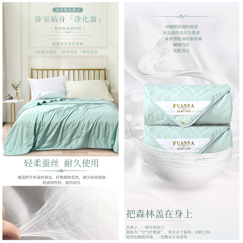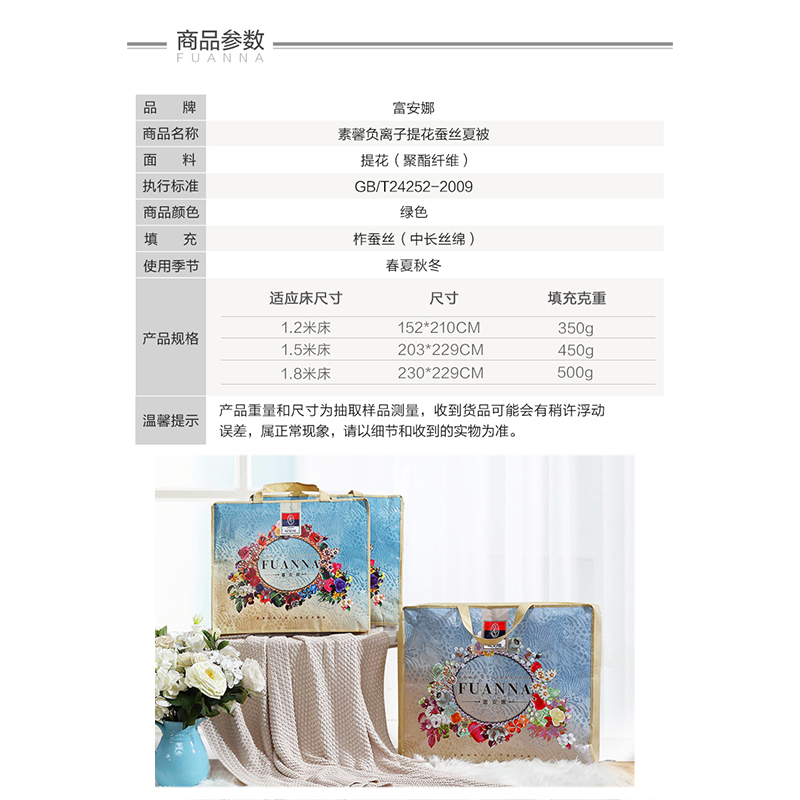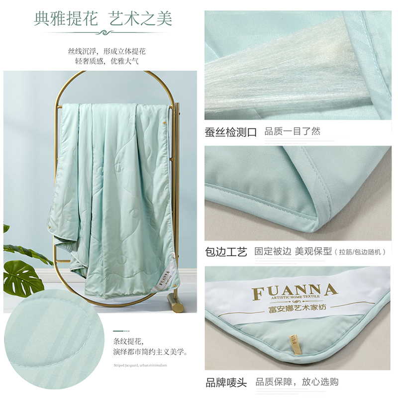 素馨负离子提花蚕丝夏被(夏被1件)(适合1.5米床)【面料:聚酯纤维;填充:柞蚕丝(中长丝绵)/绿】 |