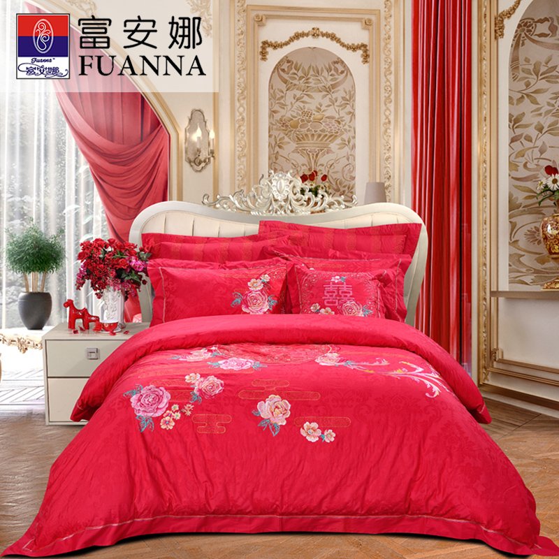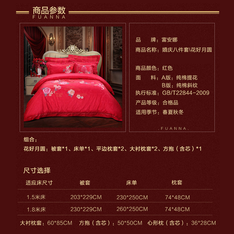 花好月圆 床单八件套(被套1件床单1件枕套4件方抱芯1件方抱套1件)(适合1.8米床)【纯棉提花/红】