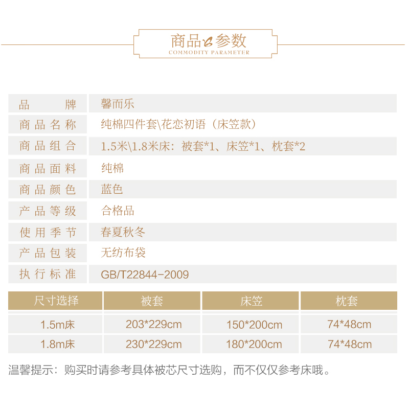 花恋初语 床笠四件套(被套1件床笠1件枕套2件)(适合1.8米床)【纯棉/蓝】