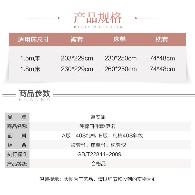 伊诺 纯棉床单四件套(被套1件床单1件枕套2件)(适合1.5米床)【40支纯棉/粉】