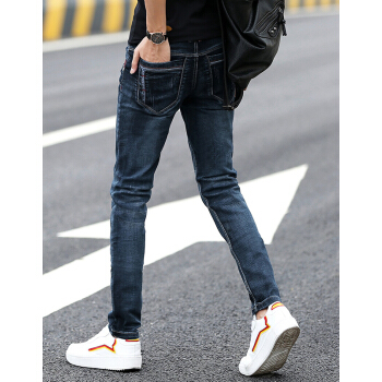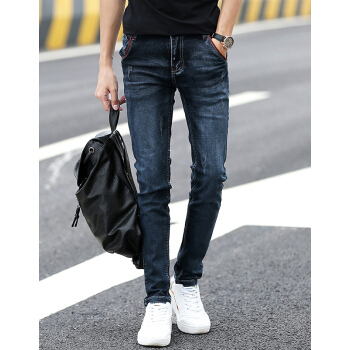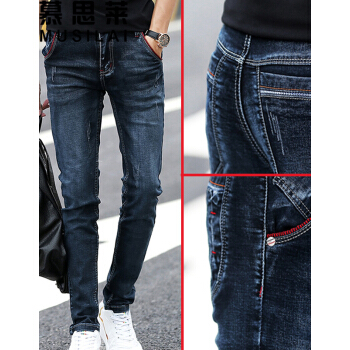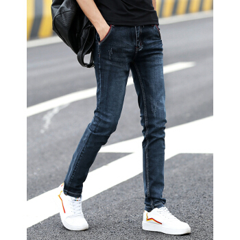 慕思莱牛仔裤男春夏薄款男装男士修身透气潮流长裤韩版休闲弹力破洞小脚裤子男生直筒宽松长裤夏季男裤 02深蓝色 31码-2尺4