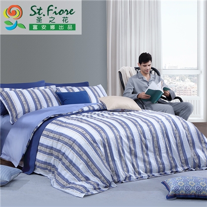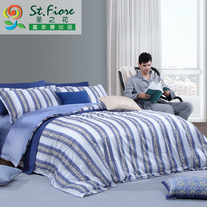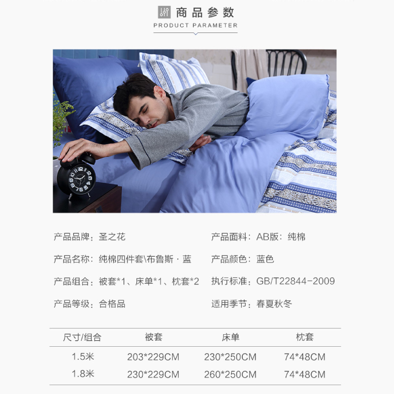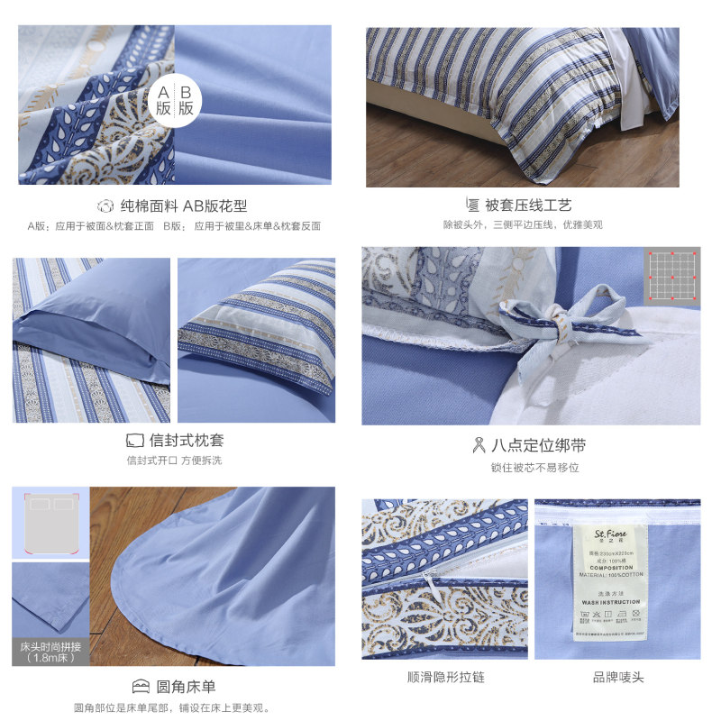 条纹 床单四件套(被套1件床单1件枕套2件)(适合1.8米床)【面料:纯棉40支斜纹/蓝】