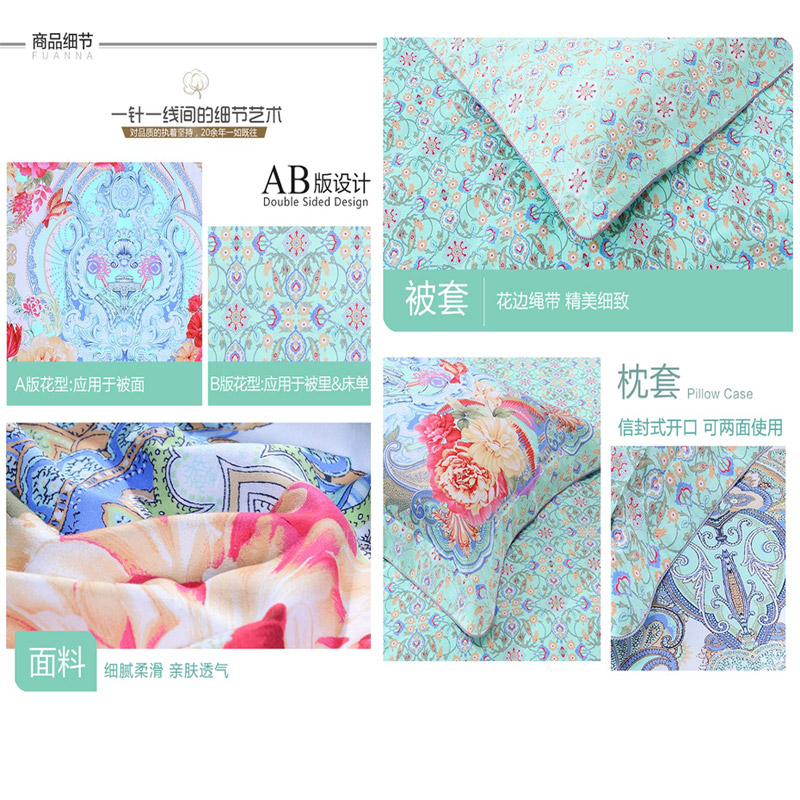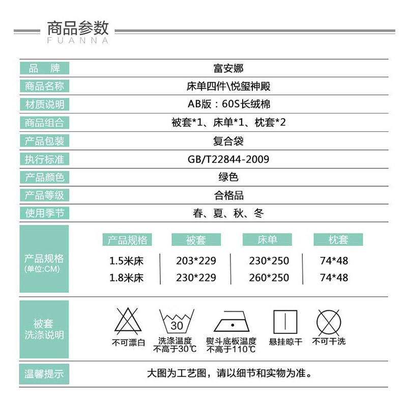 悦玺神殿 床单四件套(被套1件床单1件枕套2件)(适合1.5米床)【60支长绒棉/绿】