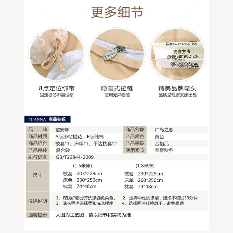 床上套件>>广岛之恋 床单四件套(被套1件 床单1件 枕套2件)(适合1.5米床)【面料1:涤粘提花;面料2纯棉/黄】