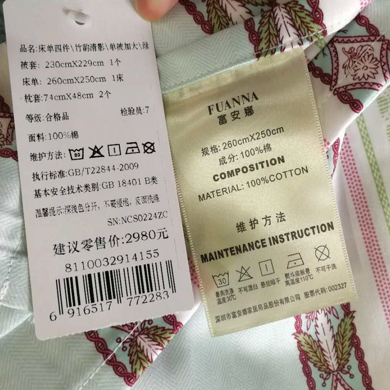 竹韵清影 床单四件套(适用1.8米床)(被套1件床单1件枕套2件)【高支高密棉/绿】