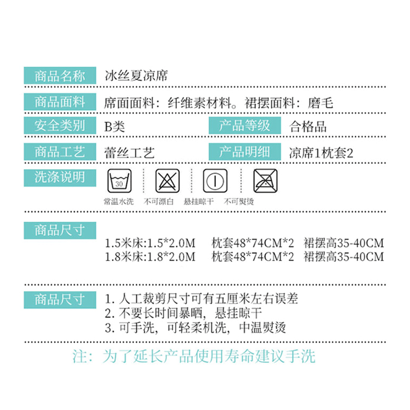 印花蕾丝床裙款冰丝席凉席三件套【冰丝(聚酯纤维)/花叶情深-兰】