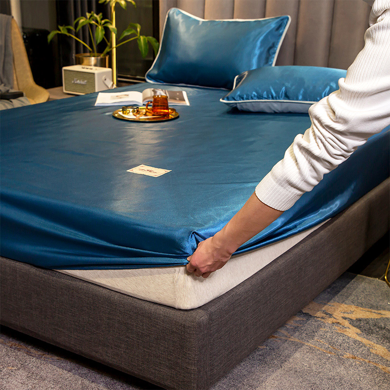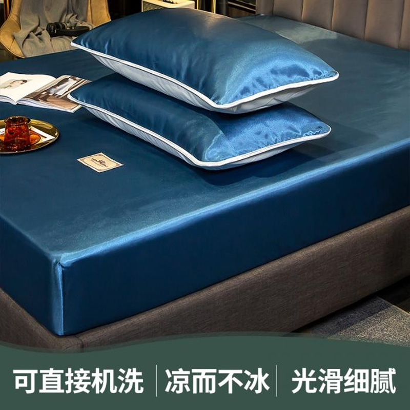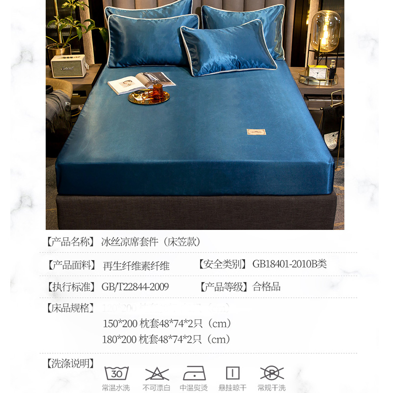 【柔软清爽 凉而不冰】无印床笠款冰丝席三件套【冰丝面料(聚酯纤维)/贵族-蓝】