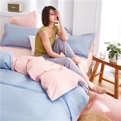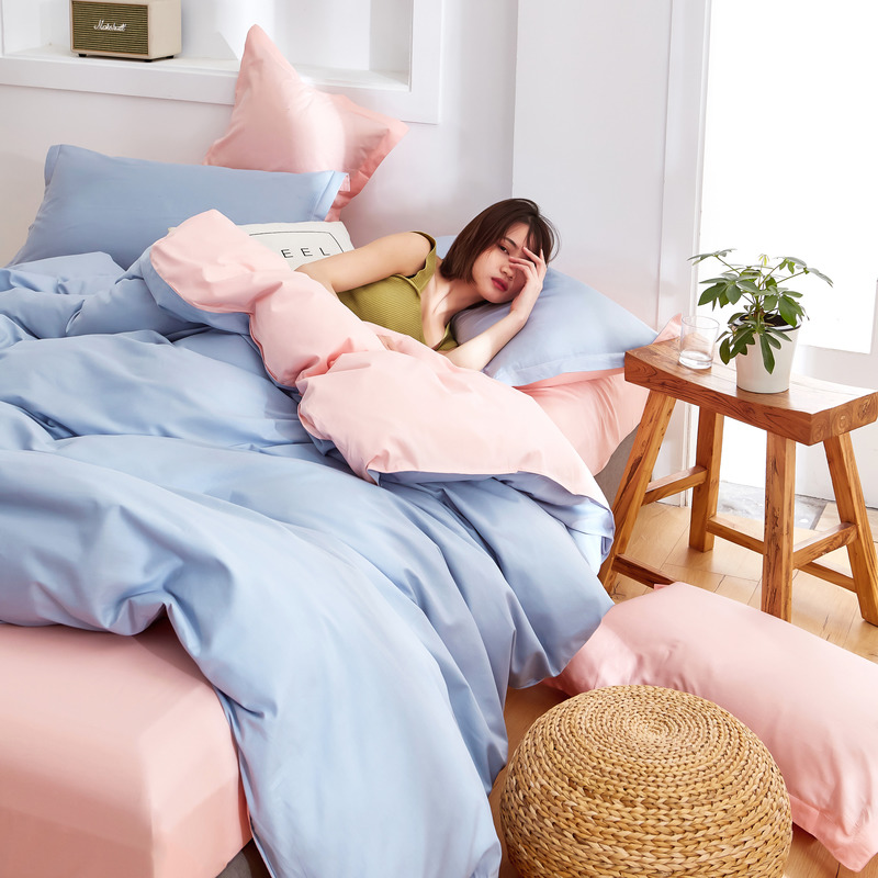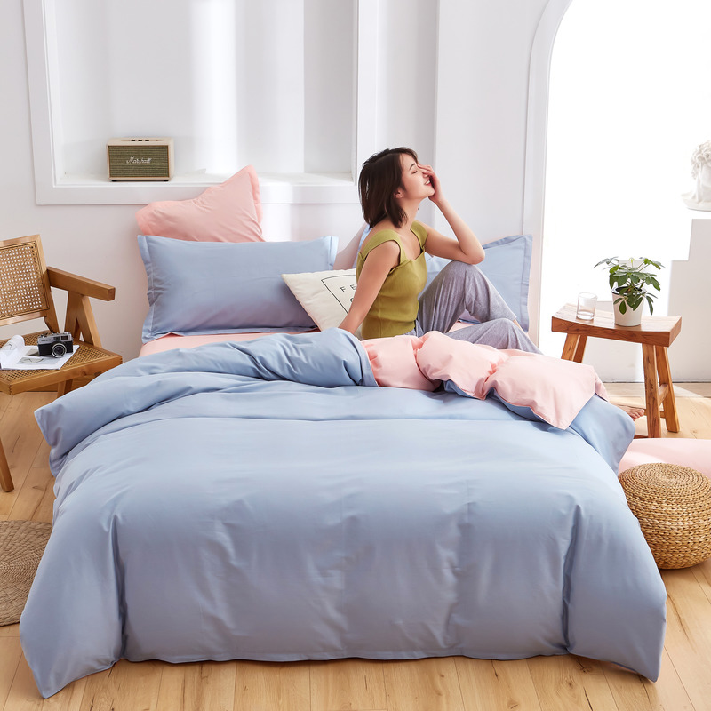 极简时尚双拼全棉喷气四件套【全棉/蓝灰+粉】