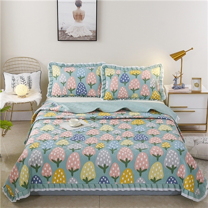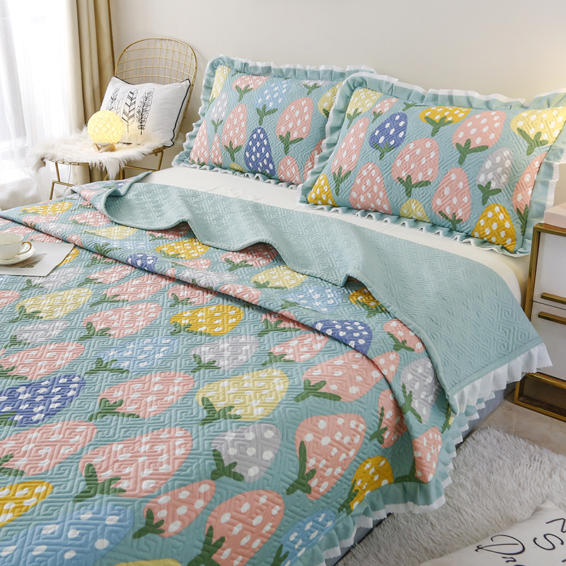 【三层复合】全棉夹棉绗缝床盖三件套【全棉/清新草莓-兰】
