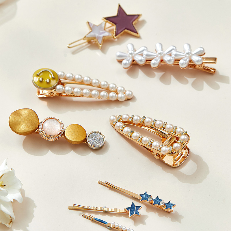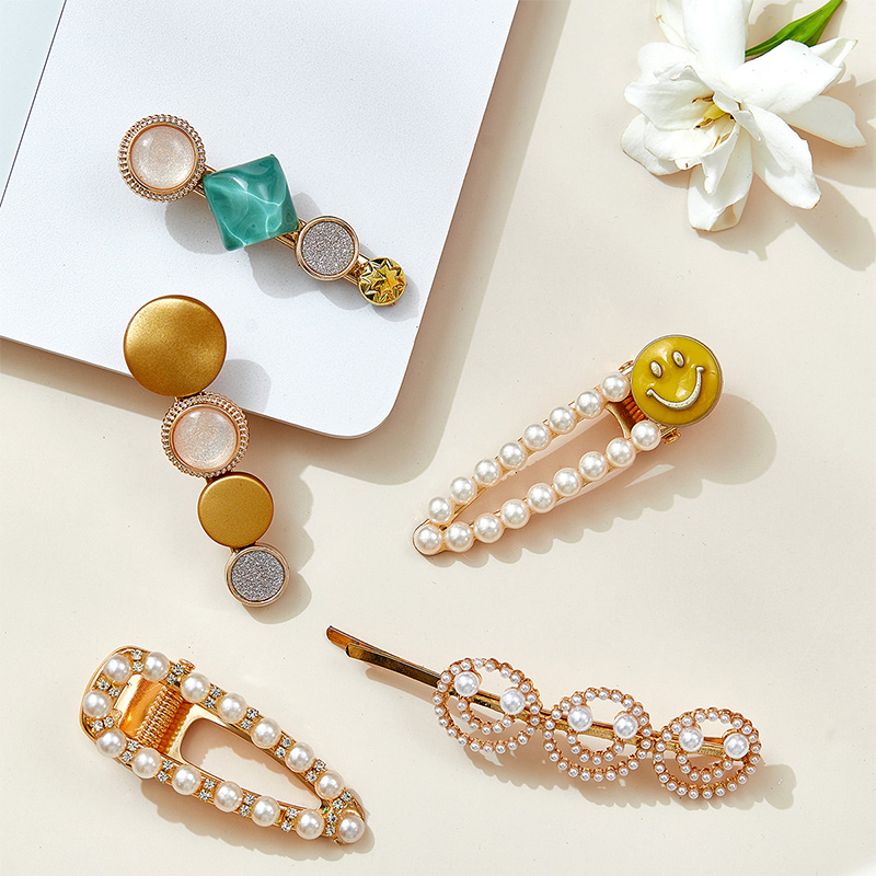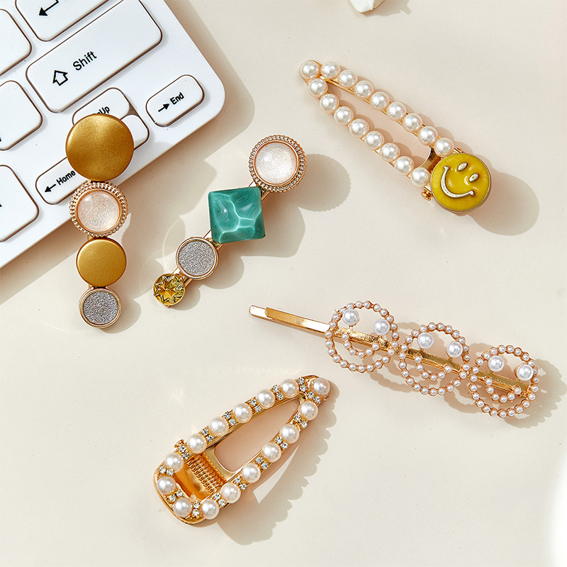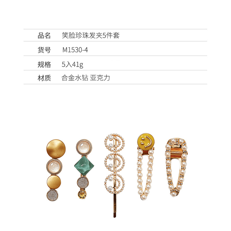 笑脸珍珠发夹5件套【合金水钻 亚克力/笑脸珍珠】