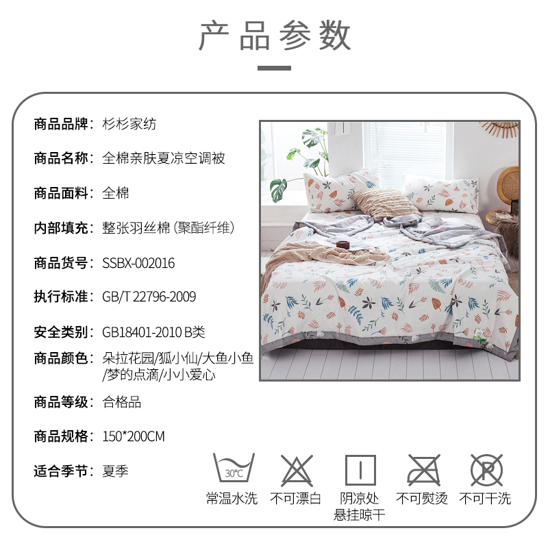 全棉亲肤夏凉空调被【面料:全棉填充:整张羽丝棉(聚酯纤维)/颜色自选】
