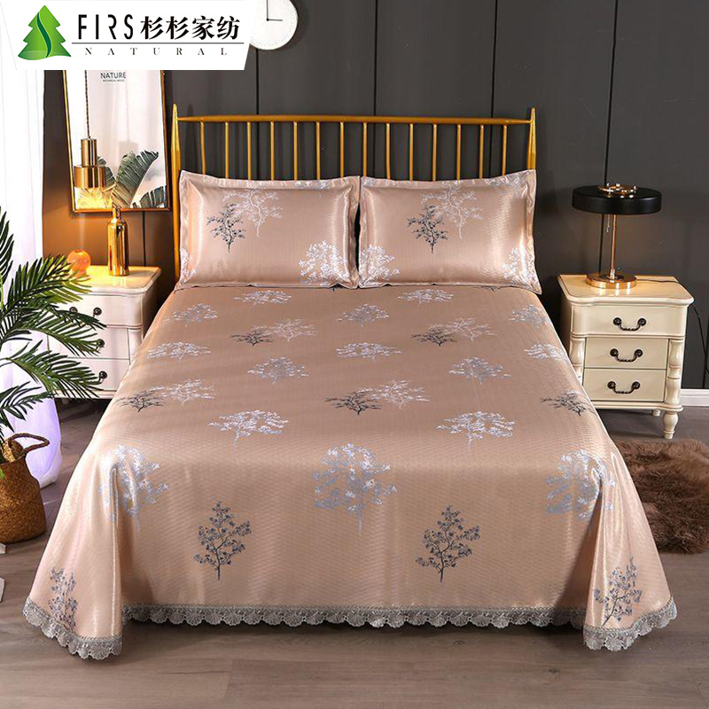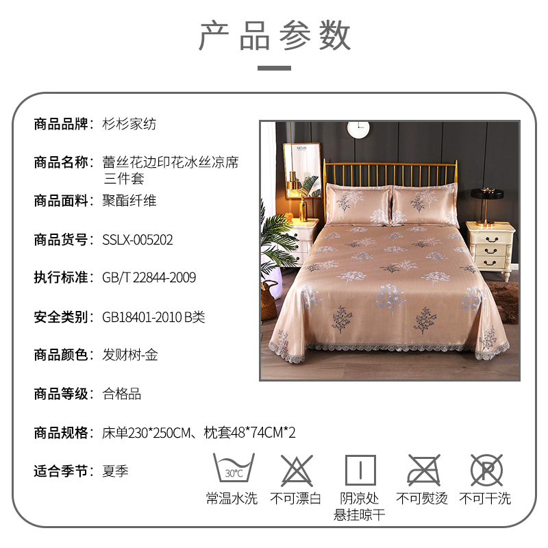 蕾丝花边印花冰丝凉席三件套【聚酯纤维/发财树-金】
