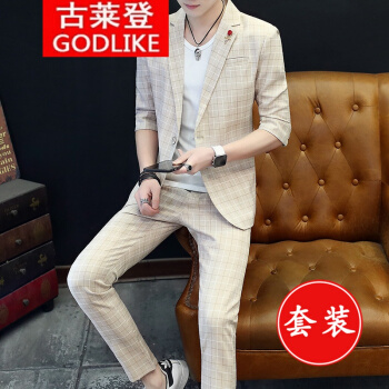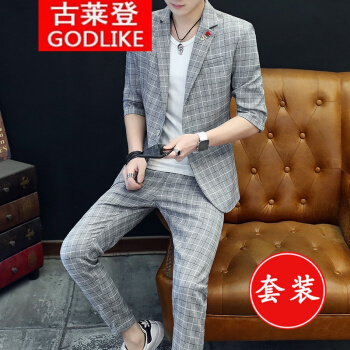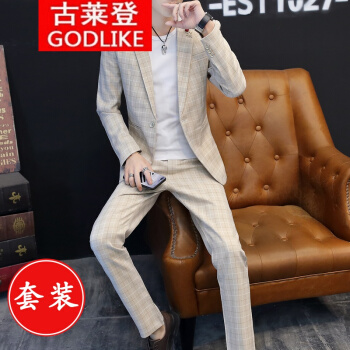 西服>>古莱登秋季男士格子休闲西装一套装韩版修身英伦风男外套小西服潮流帅气 6617长袖灰色套装+T恤 175/XL