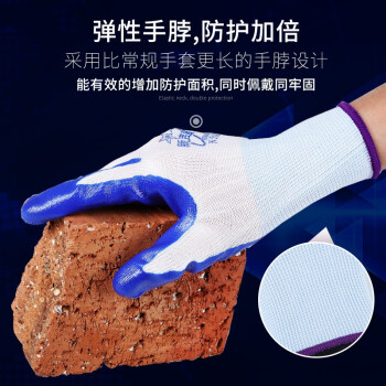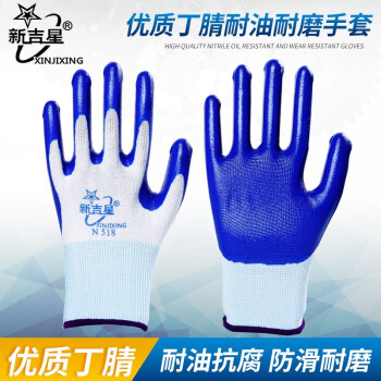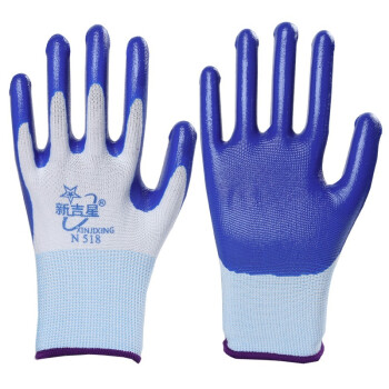 新吉星N518丁腈手套 浸胶涂胶乳胶劳保手套 防滑耐磨透气耐油耐酸碱工地工作干活防护手套N518 (进口胶)新吉星白纱蓝色【12双】
