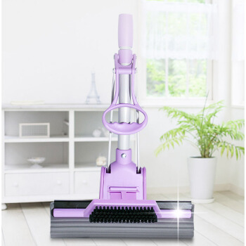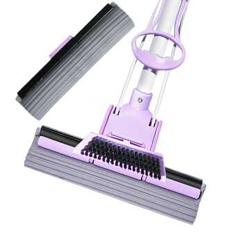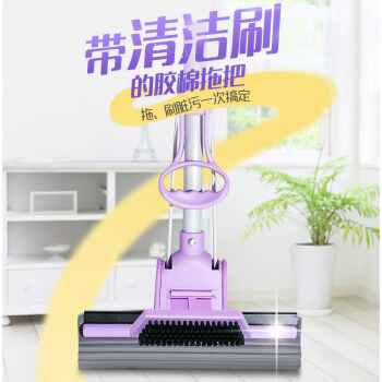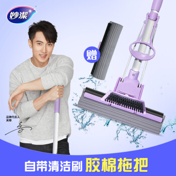 妙洁带刷海绵拖把 家用办公室吸水墩布懒人免手洗自动胶棉托地板挤水式伸缩长杆工具刮水神器 共2个替换头