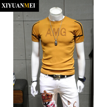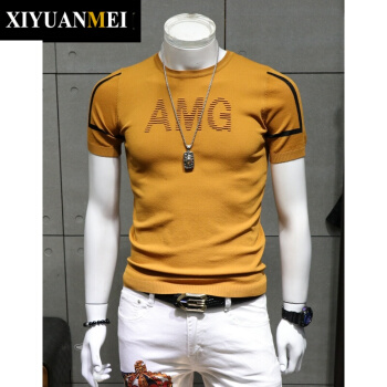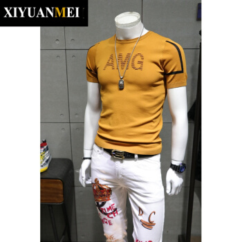 西原美潮牌 短袖毛衣男士 2020夏季韩版简约刺绣圆领修身打底针织衫男FD-FD-2250 黄色 180/92A