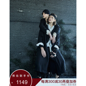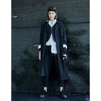 野无风衣男原创设计男装2020秋季新款男士纯色翻领多口袋后背交叉设计长款风衣男潮 粗粝黑 S