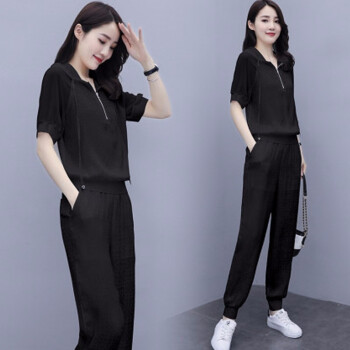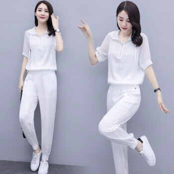 卫衣>>卿依瑟 卫衣套装女2020夏装新款减龄百搭薄款显瘦抽绳连帽纯色上衣卫衣女宽松大码九分裤两件套女潮 白色 M