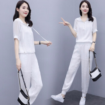 卿依瑟 卫衣套装女2020夏装新款减龄百搭薄款显瘦抽绳连帽纯色上衣卫衣女宽松大码九分裤两件套女潮 白色 M |