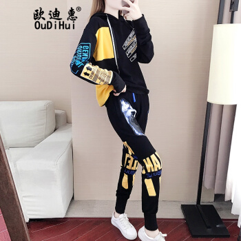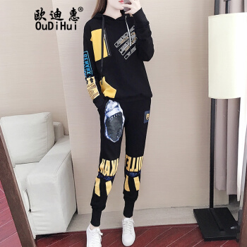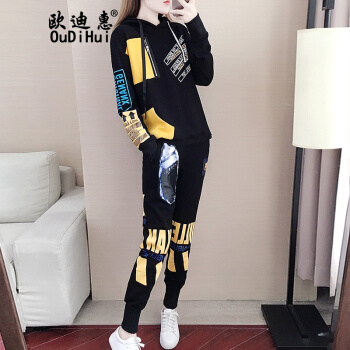 卫衣>>欧迪惠 卫衣女学生2020新款韩版春秋季运动套装女宽松个性时尚气质连帽上衣女休闲两件套潮 黑色套装 M