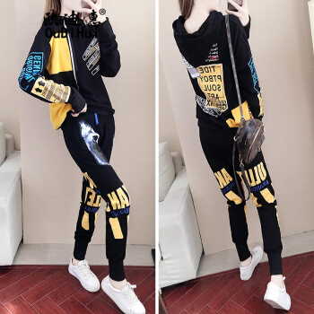 欧迪惠 卫衣女学生2020新款韩版春秋季运动套装女宽松个性时尚气质连帽上衣女休闲两件套潮 黑色套装 M |