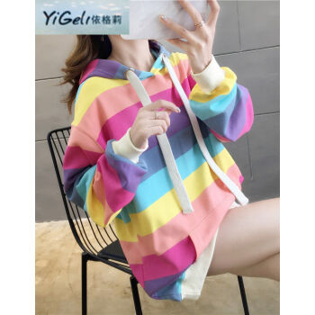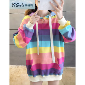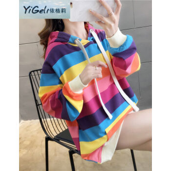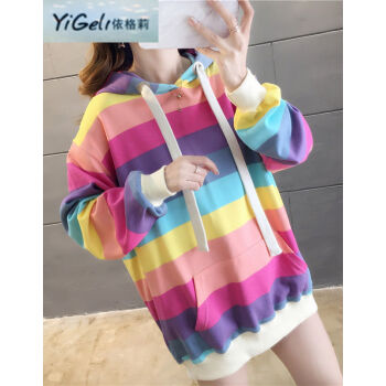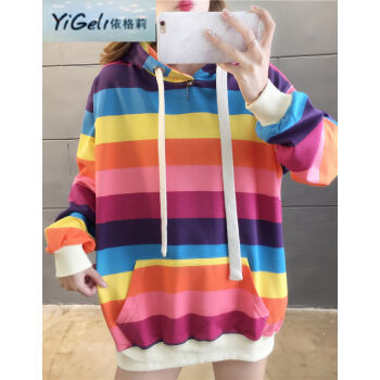 依格莉中学生少女秋天流行卫衣女2020春秋新款ins超火高中初中生宽松中长款彩虹条纹连帽大码长袖卫衣 浅色 M