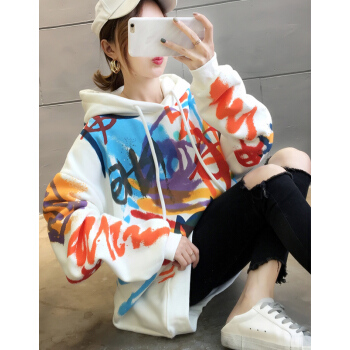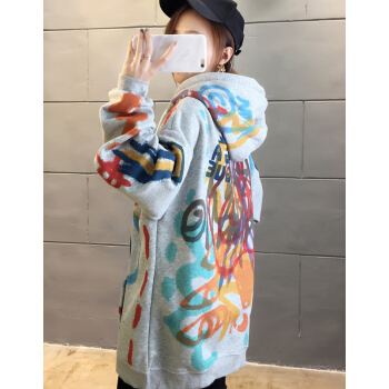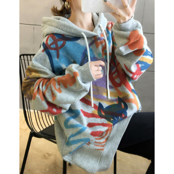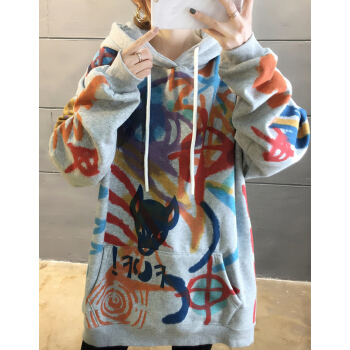 时尚欧陆 卫衣女宽松连帽中长款女士上衣潮2020春秋时尚套头韩版慵懒风印花学生款长袖嘻哈少女短外套 灰色 L