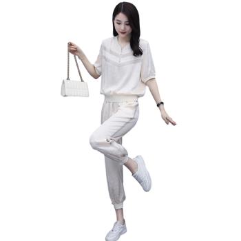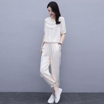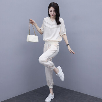杰芭锅 卫衣套装女2020年韩版新款女夏季修身洋气时尚运动气质女神范九分裤子宽松显瘦休闲两件套潮 米白色 XL |