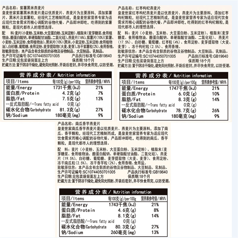 红枣枸杞&紫薯黑米&南瓜香芋燕麦片组合装
