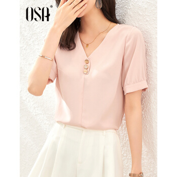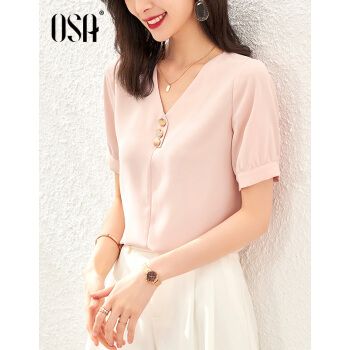 OSA欧莎气质短袖雪纺衫女遮肚子2020新款夏季欧洲站洋气小衫时尚上衣 粉色 S |