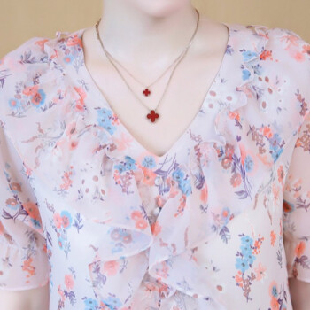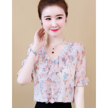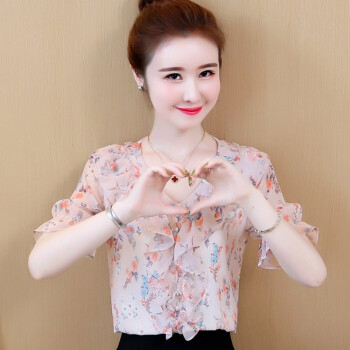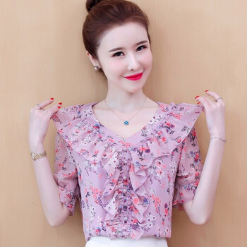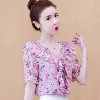 心莉美 雪纺衫女2020夏装新款v领荷叶边雪纺衬衫短显瘦洋气碎花衬衫女上衣潮 花色 L |
