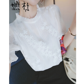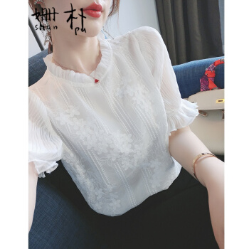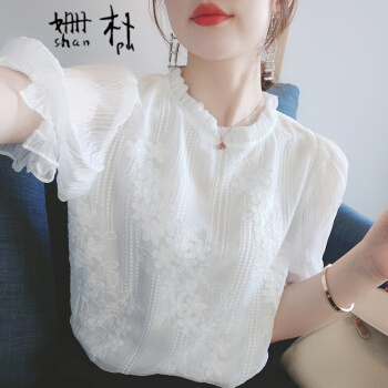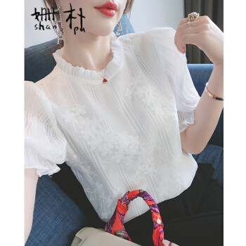 姗朴 雪纺衫女韩版2020夏季新款蕾丝刺绣衬衫女宽松显瘦洋气木耳边打底衫超仙上衣短袖立领荷叶袖蕾丝衫 白色 L |
