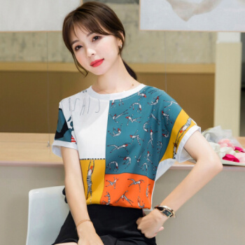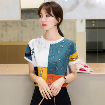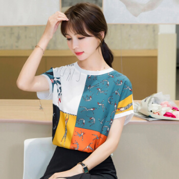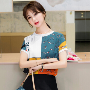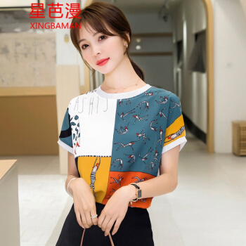 星芭漫 雪纺衫短袖女2020夏季新款上衣印花宽松薄款圆领拼接T恤衫#1049 花色 M