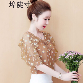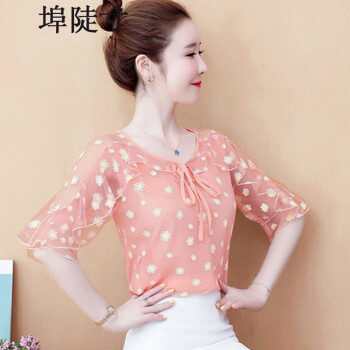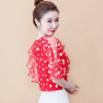 雪纺衫女埠陡寸2020夏季新品宽松显瘦蝴蝶结印花系带荷叶袖短袖上衣女 红色 S【80-95】