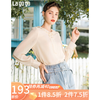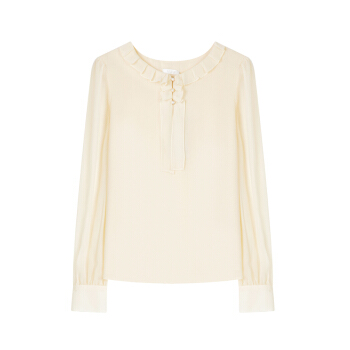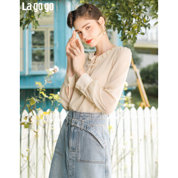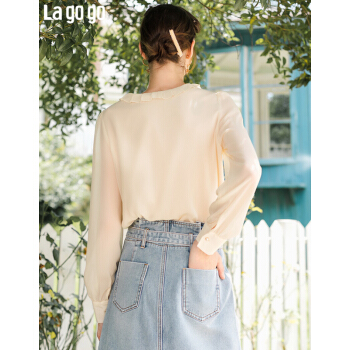 Lagogo拉谷谷2020年秋新款圆领甜美直筒型上衣长袖木耳边泡泡袖雪纺衫女JCSS537A21 浅驼色(S3) 155/S/36