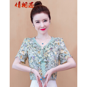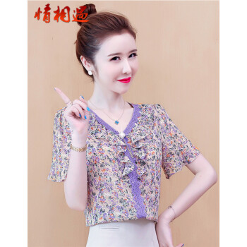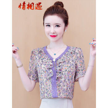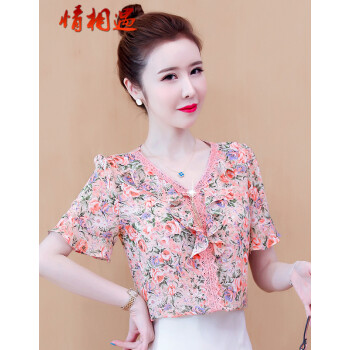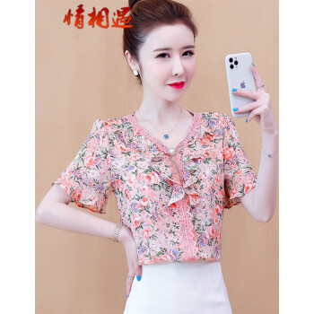情相遇 雪纺衫女短袖2020夏季新款韩版时尚V领荷叶边碎花百搭上衣宽松显瘦遮肚气质小衫 粉色 L