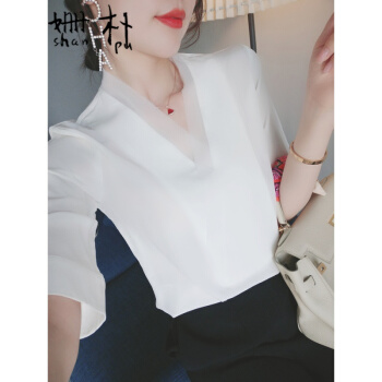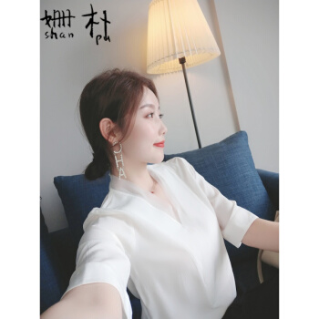 雪纺衫>>姗朴 雪纺衫女2020韩版夏季新款大码女装雪纺洋气上衣宽松显瘦气质小衫短袖休闲时尚仙气V领港味衬衫 白色 L