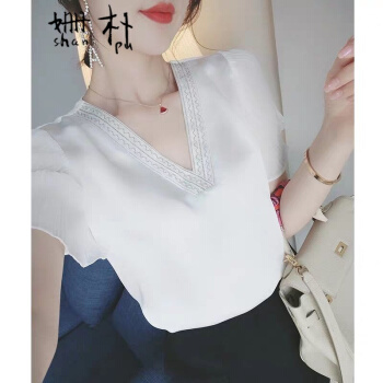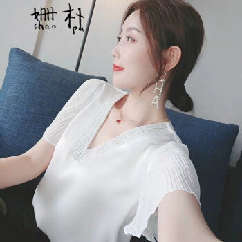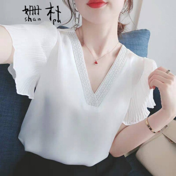 姗朴 雪纺衫女2020夏季新款大码女装印花雪纺洋气上衣宽松显瘦小衫短袖休闲时尚仙气V领港味荷叶袖衬衫 白色 L