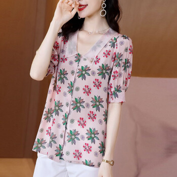 碎花雪纺衫女短袖夏季2020新款娃娃领衬衫洋气小衫法式泡泡袖时尚减龄气质衬衣潮 粉红色 L