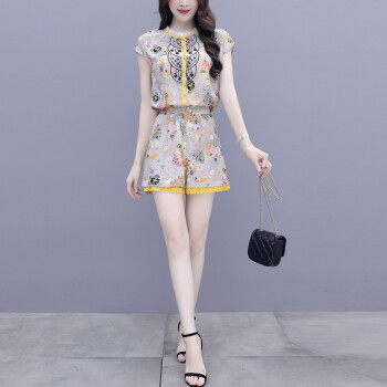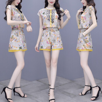 双合依恋 2020新款女装夏季职业装两件套裤复古宫廷风刺绣雪纺衫上衣阔腿短裤休闲时尚套装女 8380 黄色套装 M