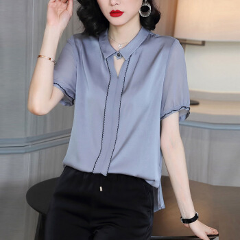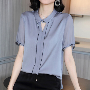 依语幽香休闲衬衫女装2020夏季新款短袖通勤衬衣百搭上衣缎面纯色 浅灰色 L